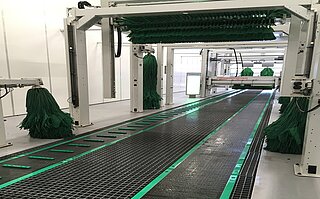 Aufschubband: schleust Fahrzeuge synchronisiert in den Waschbetrieb ein. Die sichere Lösung bei langen Waschstraßen mit Kundengang. Das Fahrzeug wird mit dem Vorderreifen bis zum Anschlag auf das stillstehende Aufschubband gefahren und von den Insassen verlassen. Nach dem Start des Aufschubbandes durch den Bediener (z. B. nach einer Vorbehandlung) wird das Fahrzeug eingeschleust.