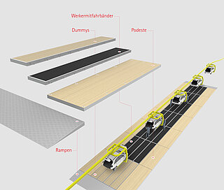 Ändern sich die Anforderungen an den Fertigungsprozess, beispielsweise bei einem Modellwechsel, werden die Bänder ganz einfach umgesetzt und es muss nicht mehr um Gruben und lange Gurtanlagen herumgeplant werden.