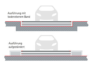 Ebenso wie bei der Automobilherstellung können Innenreinigungsbänder bodeneben oder aufgeständert montiert werden. Aufgeständerte Anlagen werden mit Rampen und Seitenpodesten für die optimale Begehbarkeit ausgestattet. Sie können mit Wannen und komplett eingehaust geliefert und montiert werden. Die komplette Bauhöhe beträgt dabei zwischen 250 und 400 mm.