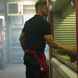 So war es auch bei Kundeneinsätzen, wo sich der Obermonteur Zeit nahm und die einzelnen Funktionen der Anlage erklärt hat. Jeffrey betont: „Er hat sich richtig viel Zeit für mich genommen. Bisher hatte ich nur einzelne Produkte wie die Palettenbeladestation gesehen, aber dazu gehört ja auch der Leerpaletteneinleger, der Robby, und vieles mehr!“