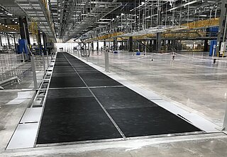 Die bereits errichteten Gruben für die Installation der geplanten breiten Bändern wurden umgehend durch den Kunden zum Großteil wieder vergossen, so dass die insgesamt 50 modularen Werkerbänder mit jeweils 6 m Länge und 1,5 m Breite sowie der flachen Bauhöhe von 120 mm installiert werden konnten. Durch die geringe Bauhöhe der Bänder sind Gruben zwar nicht notwendig, aber durch die Anpassung der bestehenden Gruben konnten die modularen Bänder bodeneben aufgestellt werden.