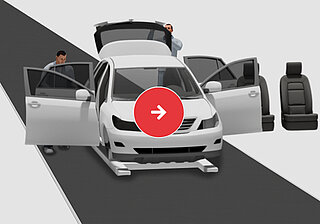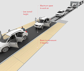 Combining them with MINDA people-mover conveyors creates exceptionally productive and ergonomically perfect working conditions. Inclined sections of the people-mover conveyors mean that conveying heights next to the skid conveyor can be perfectly adapted to suit different assembly jobs. As an alternative to people-mover conveyors, permanent platforms without any conveying functionality can also be fitted.
