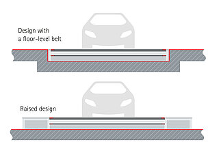 Similarly to automotive manufacturing, interior cleaning belt conveyors can be fitted at ground level or raised. Raised systems have ramps and side platforms for optimum accessibility. They can be supplied and assembled with tubs and fully enclosed. The overall height is between 250 and 400 mm.