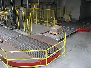 Directional changes of transport sections can be realized via turntables. It is also possible to combine pallets coming from two different directions into one main direction. However, material coming from one source direction can also be distributed in different directions.