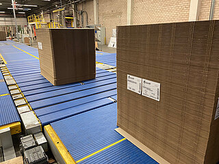 The converting machines are supplied in time with goods for conversion according to the definitions of the ERP systems. After the conversion, the corrugated cardboard stacks are discharged from the machines and fed to the pallet protection. (picture 2) Here the correct pallet type is automatically prepared and the data for the strapping are available. The secured goods reach the finished goods storage and are ready for despatch.