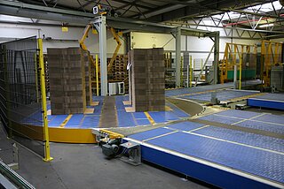 The standard task for a turntable is a change of the transport direction. With an appropriate size and the equipment with two parallel conveyors, up to four blocks can be picked up and turned simultaneously to meet the high performance requirements of transfer cars in the finished goods transport.