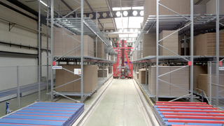 In-house storages are compact storage solutions that can be integrated into existing space conditions. An efficient solution is given starting from a hall height of 10 m. The stacks of corrugated cardboard to be stored can be stored without pallets or in the finished goods area also on pallets.