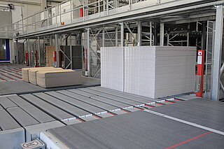 In the discharge area behind the corrugator the system exactly defines how and in which order and sequence the corrugated cardboard stacks reach the intermediate storage and the converting machines with an optimal utilization of the transport capacity.