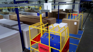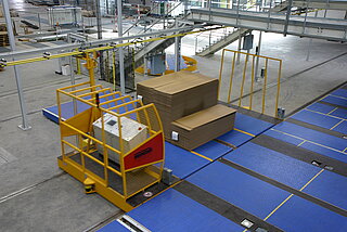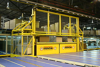The converting machines are supplied in time with goods for conversion according to the definitions of the ERP systems. After the conversion, the corrugated cardboard stacks are discharged from the machines and fed to the pallet protection. (picture 2) Here the correct pallet type is automatically prepared and the data for the strapping are available. The secured goods reach the finished goods storage and are ready for despatch.