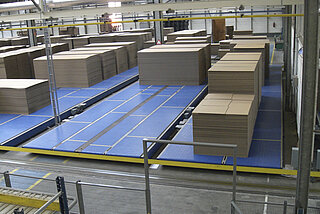In the discharge area behind the corrugator the system exactly defines how and in which order and sequence the corrugated cardboard stacks reach the intermediate storage and the converting machines with an optimal utilization of the transport capacity.