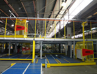 There are two different concepts for two-level intermediate storages. One has got a central transfer car which can distribute the stacks into the lower and upper level via a lift. However, this concept must be locked off from the outside. The storage area is, therefore, not accessible, as the falling down of stacks represents a safety risk. The second concept has got transfer cars on both levels and the stacks are conveyed to the second level via a lifting station. We take your special conditions on site into consideration and are happy to work out a suitable solution together with you.