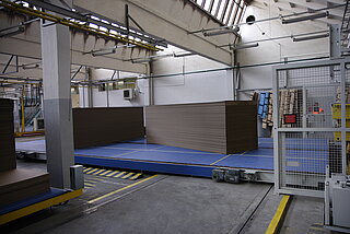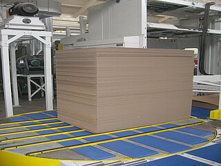 In the discharge area behind the corrugator the system exactly defines how and in which order and sequence the corrugated cardboard stacks reach the intermediate storage and the converting machines with an optimal utilization of the transport capacity.