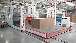The converting machines are supplied in time with goods for conversion according to the definitions of the ERP systems. After the conversion, the corrugated cardboard stacks are discharged from the machines and fed to the pallet protection. (picture 2) Here the correct pallet type is automatically prepared and the data for the strapping are available. The secured goods reach the finished goods storage and are ready for despatch.
