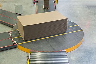 In the discharge area behind the corrugator the system exactly defines how and in which order and sequence the corrugated cardboard stacks reach the intermediate storage and the converting machines with an optimal utilization of the transport capacity.