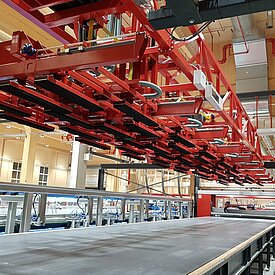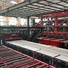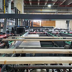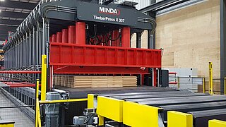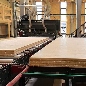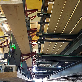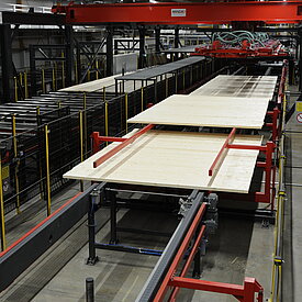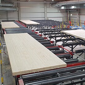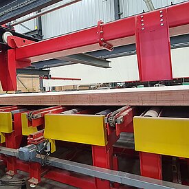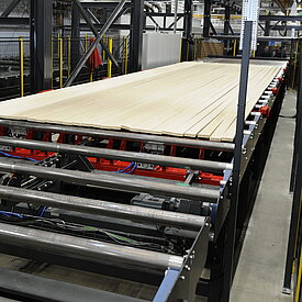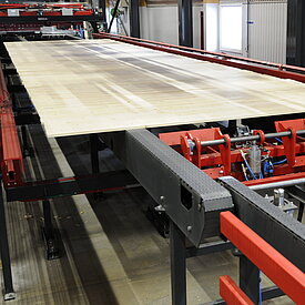 We reliably transport the CLT boards behind the cross-laminated timber press to the subsequent processing machines such as