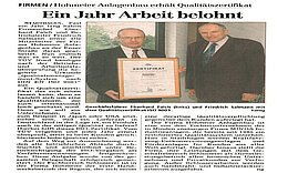Certification of subsidiary Hohmeier Anlagenbau GmbH according to DIN EN ISO 9001